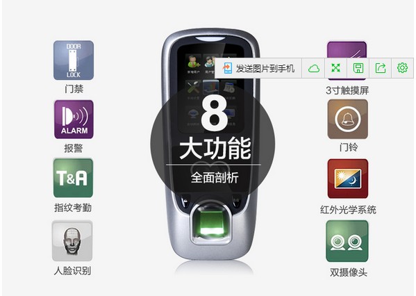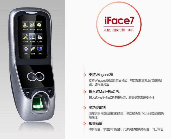 该产品采用了中控科技最新的ZEM600核心板,ZKFinger10.0指纹面部混合识别算法,容量大,识别速度快,集成高分辨率夜视红外和彩色双摄像头功能,适用范围广,不受外界光线的影响,无论是在强光下还是在黑暗中也能进行有效识别。该系列已经通过了超过10万面部数据库长达2年的测试,同时该算法也在美国San Jose大学年度测试中名列前茅,在用户舒适度方面获得了最佳评分。iFace采用了嵌入式中控Multi-Bio CPU,主频为630MHZ,可以处理高达1:20000的1:N速度,符合人体工程学的外观设计,工业设计由德国专业公司主导完成,模具采用了PC材料+蚀纹工艺+镜面工艺,采集比对就如照镜子一般,支持4.3寸全触摸TFT,仅有6个状态功能键,其它按键在TFT上全触摸操作。标配TCP/IP通讯方式,支持跨网段跨网关连接
